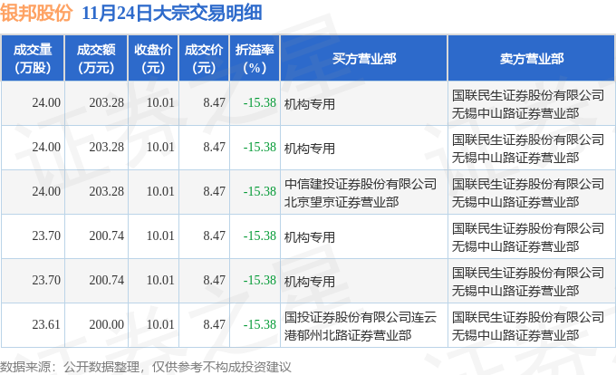 证券之星消息,11月24日银邦股份发生大宗交易,交易数据如下: