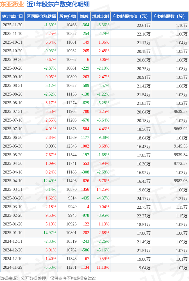 从股价来看,2025年11月10日至2025年11月20日,东亚药业区间跌幅为1.39%,在此期间股东户数减少364.0户,减幅为3.36%。