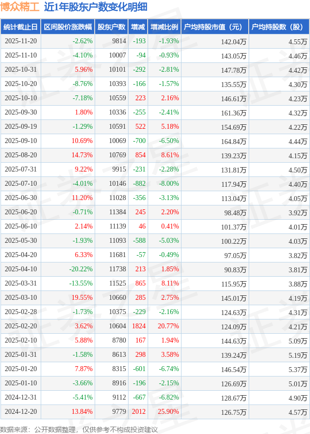 从股价来看,2025年11月10日至2025年11月20日,博众精工区间跌幅为2.62%,在此期间股东户数减少193.0户,减幅为1.93%。