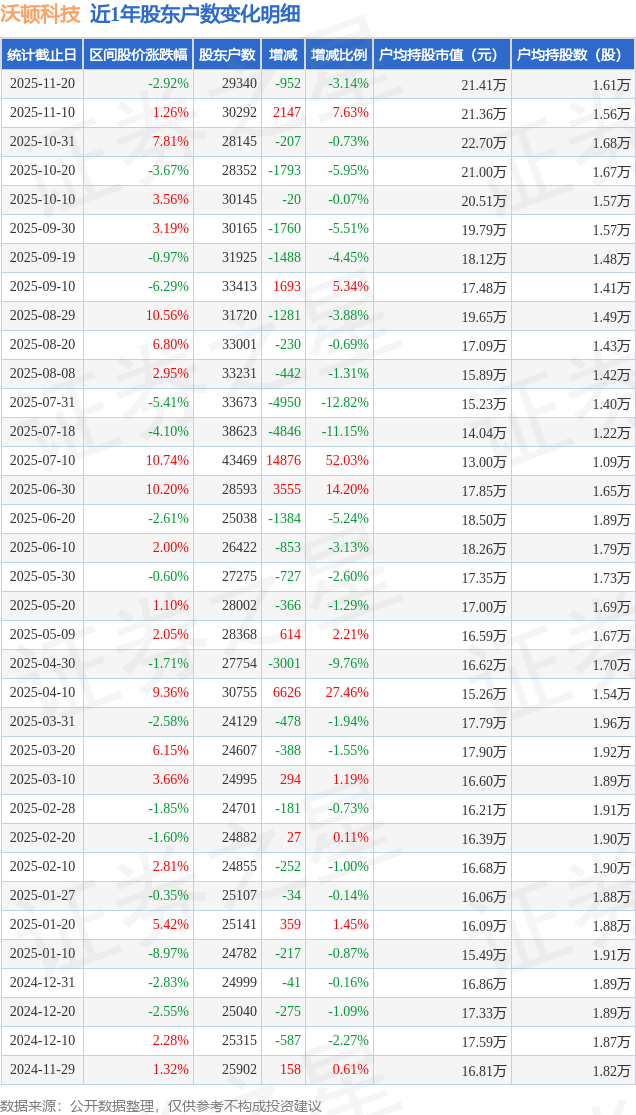 从股价来看,2025年11月10日至2025年11月20日,沃顿科技区间跌幅为2.92%,在此期间股东户数减少952.0户,减幅为3.14%。