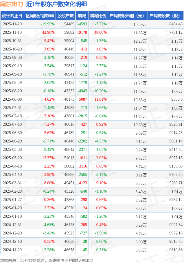 从股价来看,2025年11月10日至2025年11月20日,闽东电力区间跌幅为19.95%,在此期间股东户数减少4593.0户,减幅为7.77%。