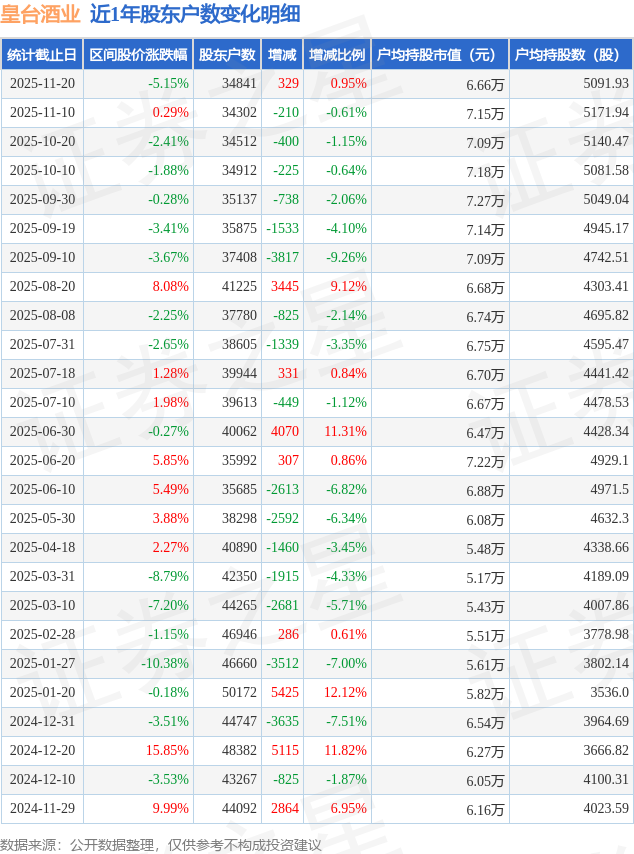 从股价来看,2025年10月20日至2025年11月20日,皇台酒业区间跌幅为5.15%,在此期间股东户数增加329.0户,增幅为0.95%。