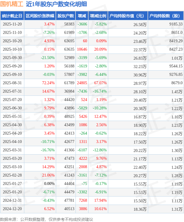 从股价来看,2025年11月10日至2025年11月20日,国机精工区间涨幅为3.47%,在此期间股东户数减少3606.0户,减幅为5.82%。