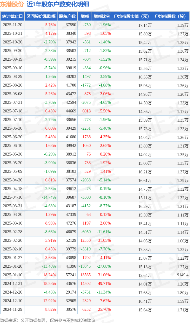 从股价来看,2025年10月31日至2025年11月20日,东港股份区间涨幅为5.76%,在此期间股东户数减少750.0户,减幅为1.96%。