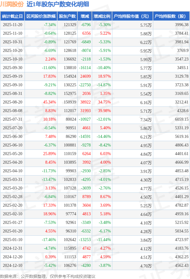 从股价来看,2025年11月10日至2025年11月20日,川润股份区间跌幅为7.34%,在此期间股东户数减少6796.0户,减幅为5.3%。
