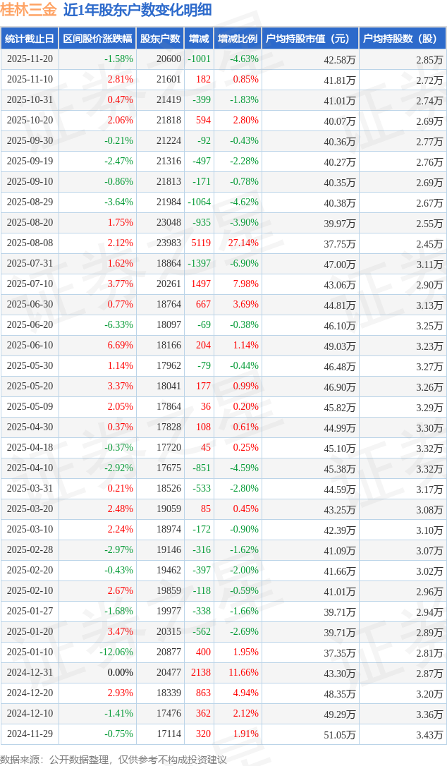 从股价来看,2025年11月10日至2025年11月20日,桂林三金区间跌幅为1.58%,在此期间股东户数减少1001.0户,减幅为4.63%。