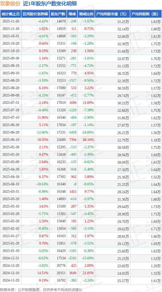 证券之星消息,近日双象股份披露,截至2025年11月20日公司股东户数为1.47万户,较11月10日减少249.0户,减幅为1.67%。户均持股数量由上期的1.8万股增加至1.83万股,户均持股市值为31.25万元。