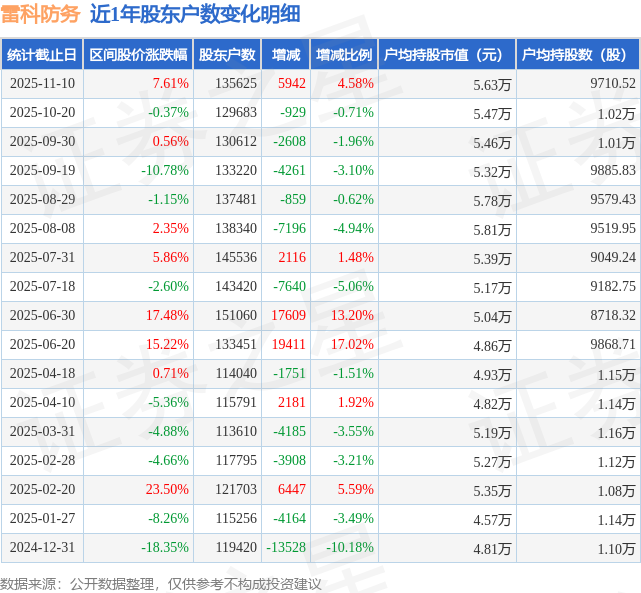 从股价来看,2025年10月20日至2025年11月10日,雷科防务区间涨幅为7.61%,在此期间股东户数增加5942.0户,增幅为4.58%。