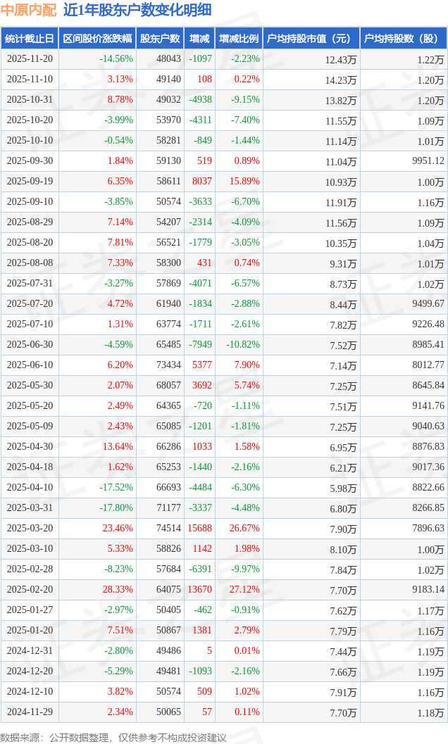 从股价来看,2025年11月10日至2025年11月20日,中原内配区间跌幅为14.56%,在此期间股东户数减少1097.0户,减幅为2.23%。