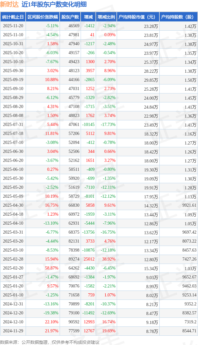 从股价来看,2025年11月10日至2025年11月20日,新时达区间跌幅为5.11%,在此期间股东户数减少1412.0户,减幅为2.94%。