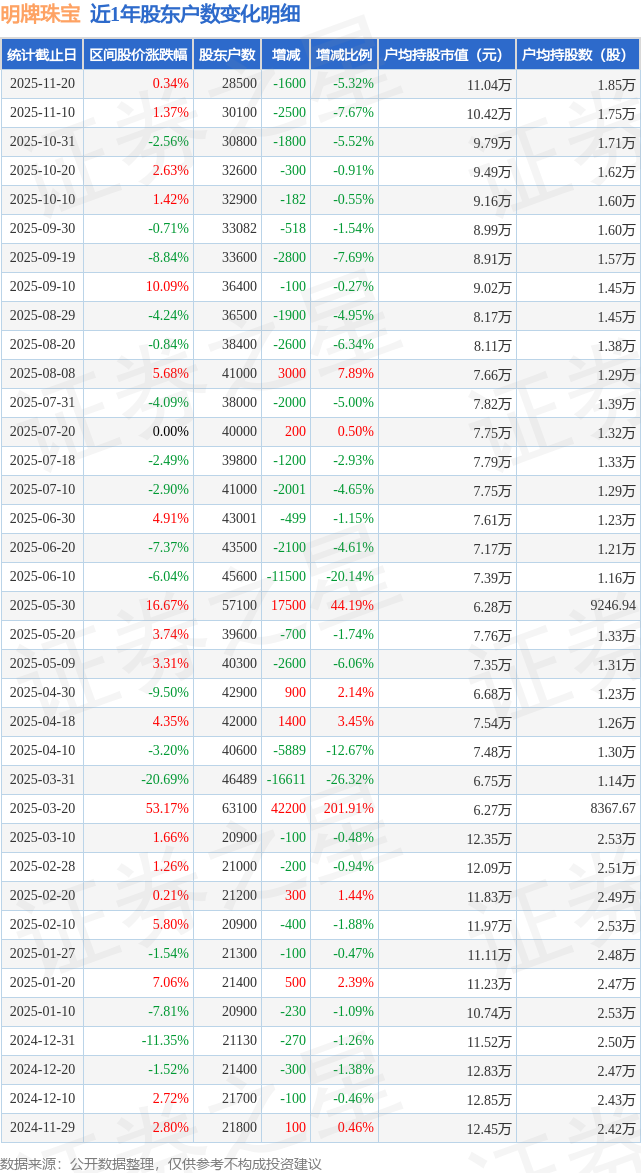 从股价来看,2025年11月10日至2025年11月20日,明牌珠宝区间涨幅为0.34%,在此期间股东户数减少1600.0户,减幅为5.32%。