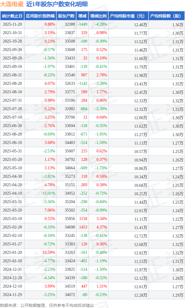 从股价来看,2025年10月31日至2025年11月20日,大连电瓷区间涨幅为0.88%,在此期间股东户数减少1449.0户,减幅为4.28%。