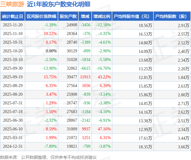 证券之星消息,近日三峡旅游披露,截至2025年11月20日公司股东户数为2.49万户,较11月10日减少3456.0户,减幅为12.18%。户均持股数量由上期的2.55万股增加至2.91万股,户均持股市值为18.56万元。