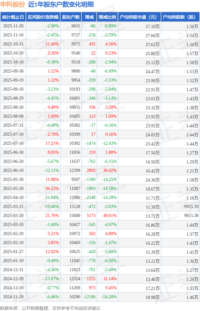 从股价来看,2025年11月10日至2025年11月20日,申科股份区间跌幅为2.9%,在此期间股东户数减少86.0户,减幅为0.89%。