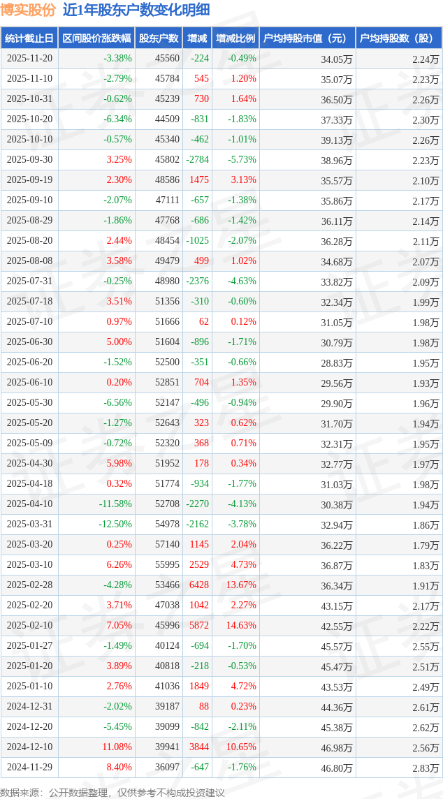 从股价来看,2025年11月10日至2025年11月20日,博实股份区间跌幅为3.38%,在此期间股东户数减少224.0户,减幅为0.49%。