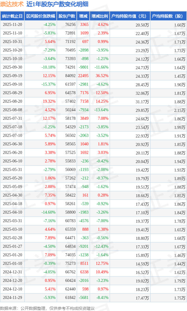 从股价来看,2025年11月10日至2025年11月20日,崇达技术区间跌幅为4.25%,在此期间股东户数增加3365.0户,增幅为4.62%。
