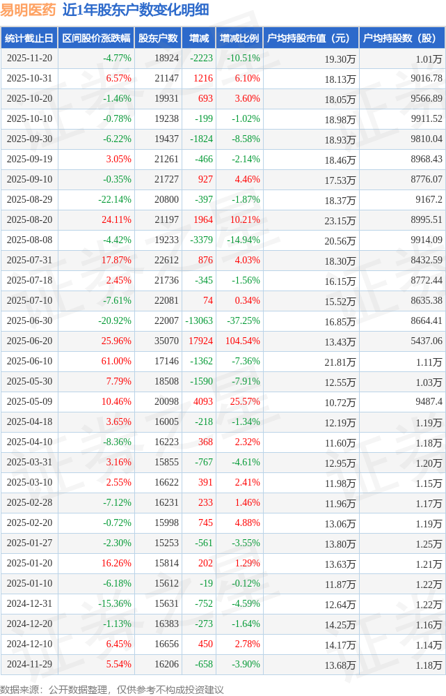 从股价来看,2025年10月31日至2025年11月20日,易明医药区间跌幅为4.77%,在此期间股东户数减少2223.0户,减幅为10.51%。