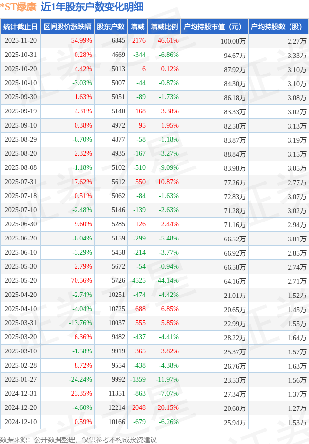 从股价来看,2025年10月31日至2025年11月20日,*ST绿康区间涨幅为54.99%,在此期间股东户数增加2176.0户,增幅为46.61%。