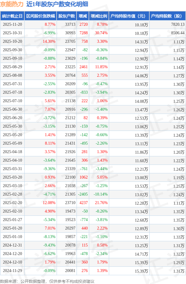 从股价来看,2025年10月31日至2025年11月20日,京能热力区间涨幅为8.77%,在此期间股东户数增加2720.0户,增幅为8.78%。