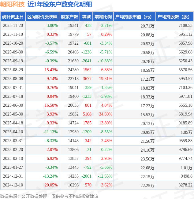 从股价来看,2025年11月10日至2025年11月20日,朝阳科技区间跌幅为3.0%,在此期间股东户数减少438.0户,减幅为2.21%。