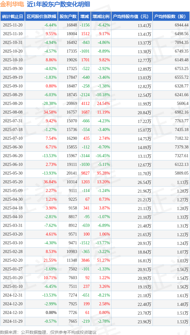 从股价来看,2025年11月10日至2025年11月20日,金利华电区间跌幅为6.44%,在此期间股东户数减少1156.0户,减幅为6.42%。