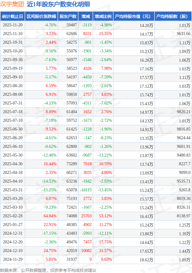 从股价来看,2025年11月10日至2025年11月20日,汉宇集团区间跌幅为4.76%,在此期间股东户数减少3119.0户,减幅为4.98%。