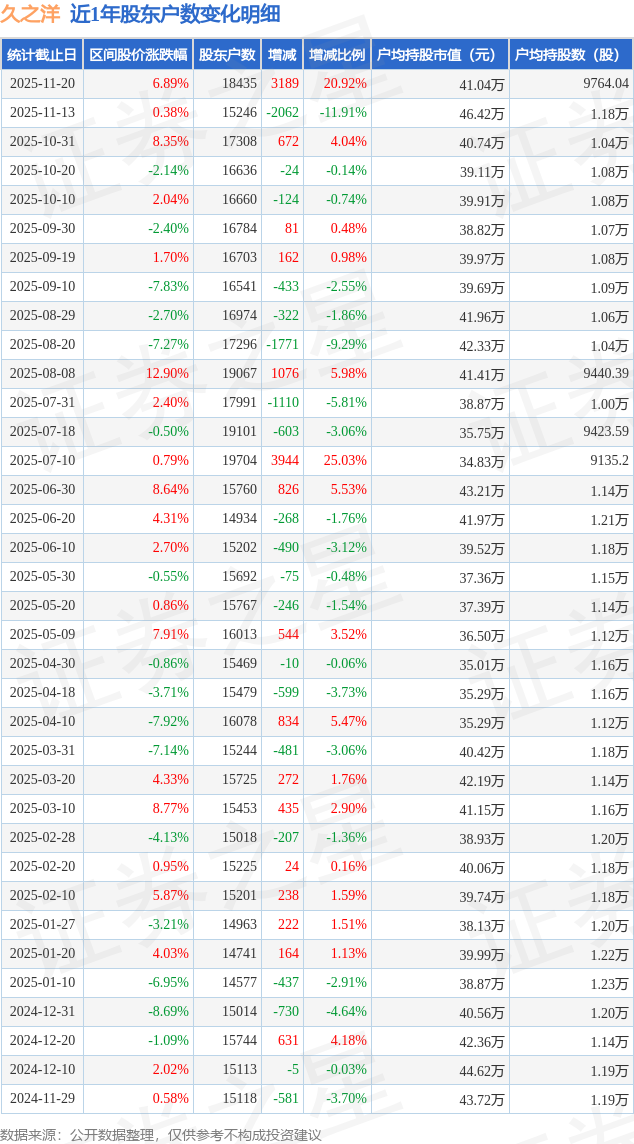 从股价来看,2025年11月13日至2025年11月20日,久之洋区间涨幅为6.89%,在此期间股东户数增加3189.0户,增幅为20.92%。