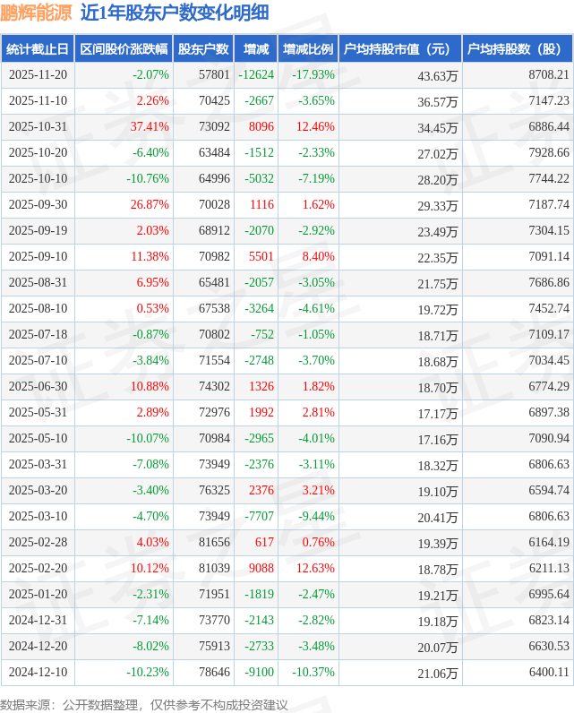 从股价来看,2025年11月10日至2025年11月20日,鹏辉能源区间跌幅为2.07%,在此期间股东户数减少1.26万户,减幅为17.93%。