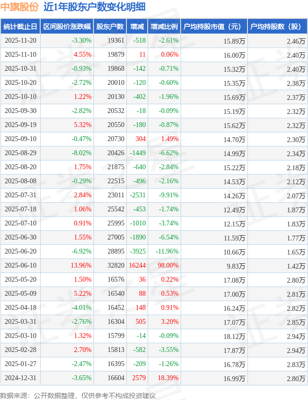 从股价来看,2025年11月10日至2025年11月20日,中旗股份区间跌幅为3.3%,在此期间股东户数减少518.0户,减幅为2.61%。
