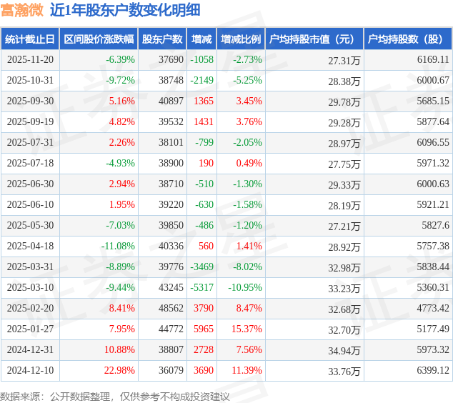 从股价来看,2025年10月31日至2025年11月20日,富瀚微区间跌幅为6.39%,在此期间股东户数减少1058.0户,减幅为2.73%。