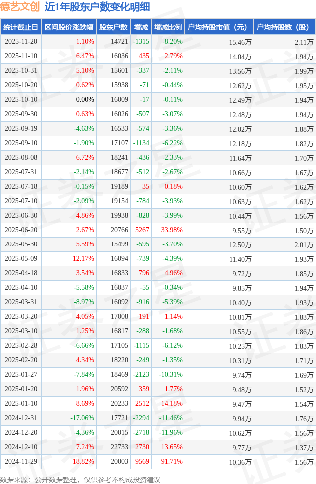 从股价来看,2025年11月10日至2025年11月20日,德艺文创区间涨幅为1.1%,在此期间股东户数减少1315.0户,减幅为8.2%。