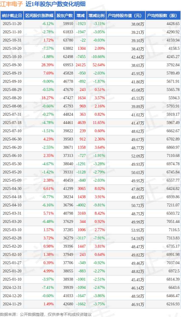 从股价来看,2025年11月10日至2025年11月20日,江丰电子区间跌幅为6.12%,在此期间股东户数减少1923.0户,减幅为3.11%。