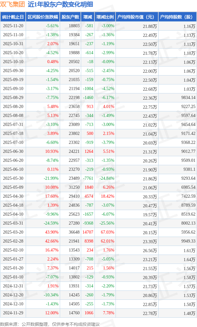 从股价来看,2025年11月10日至2025年11月20日,双飞集团区间跌幅为5.61%,在此期间股东户数减少581.0户,减幅为3.0%。
