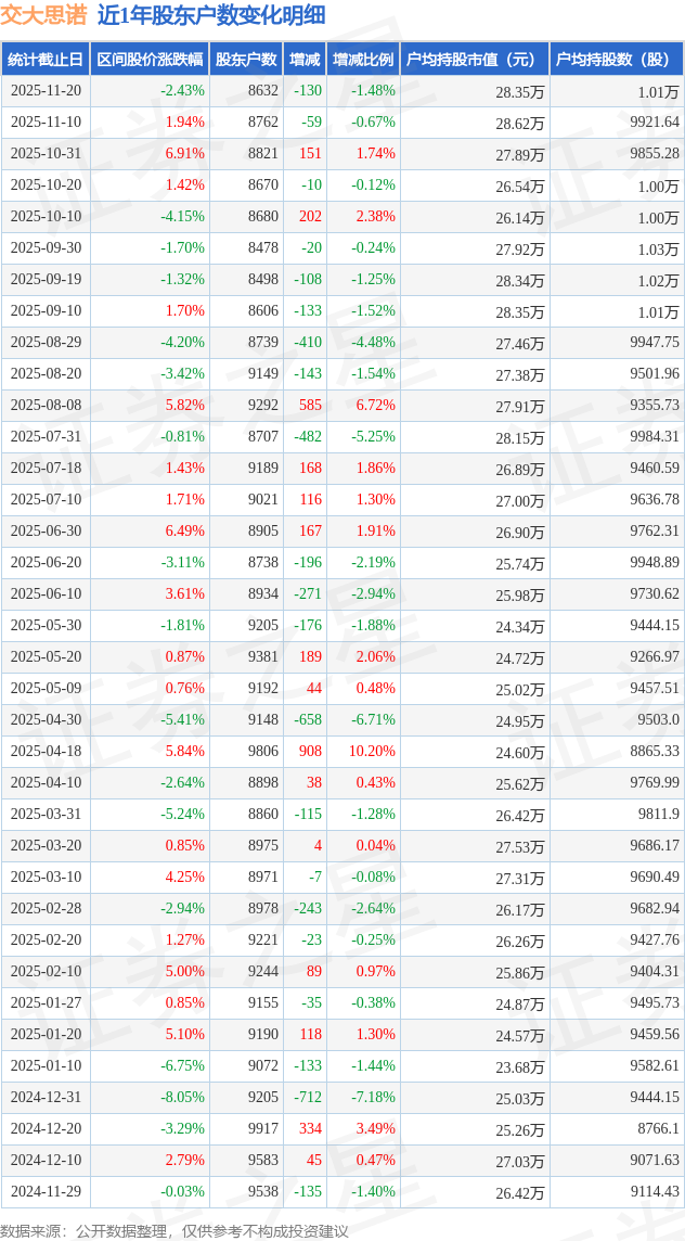 证券之星消息,近日交大思诺披露,截至2025年11月20日公司股东户数为8632.0户,较11月10日减少130.0户,减幅为1.48%。户均持股数量由上期的9922.0股增加至1.01万股,户均持股市值为28.35万元。