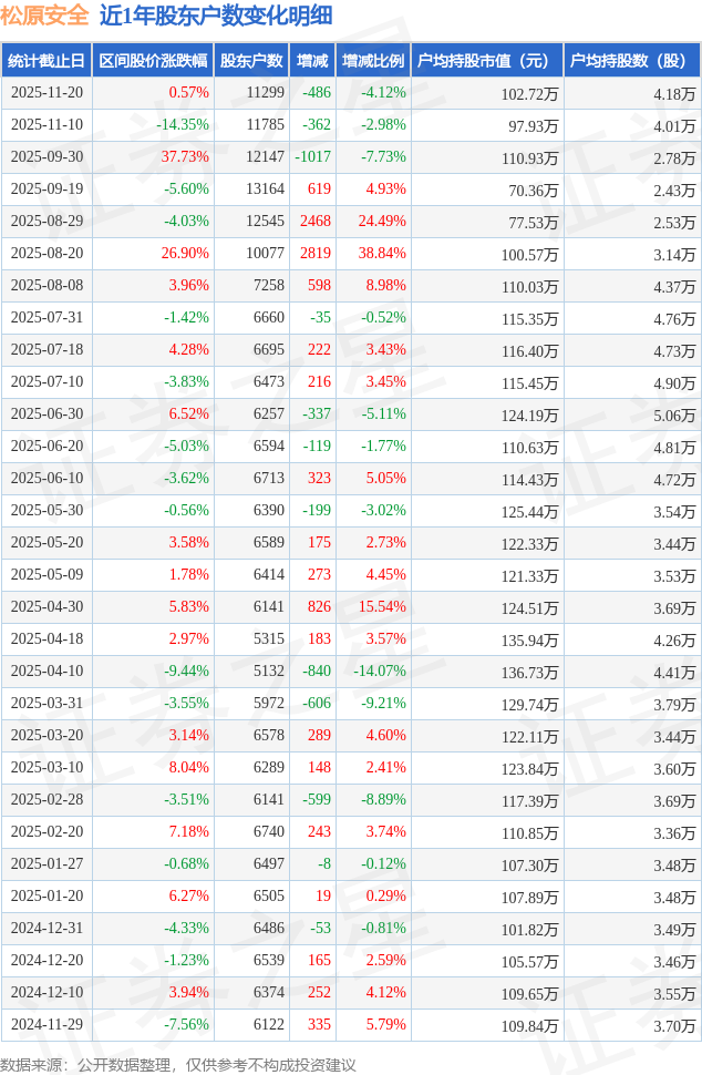 从股价来看,2025年11月10日至2025年11月20日,松原安全区间涨幅为0.57%,在此期间股东户数减少486.0户,减幅为4.12%。