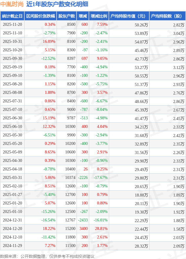 证券之星消息,近日中胤时尚披露,截至2025年11月20日公司股东户数为8500.0户,较11月10日增加600.0户,增幅为7.59%。户均持股数量由上期的3.04万股减少至2.82万股,户均持股市值为50.26万元。