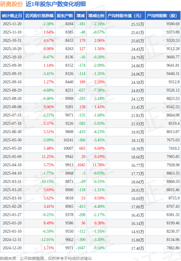 从股价来看,2025年11月10日至2025年11月20日,研奥股份区间跌幅为2.38%,在此期间股东户数减少181.0户,减幅为2.16%。