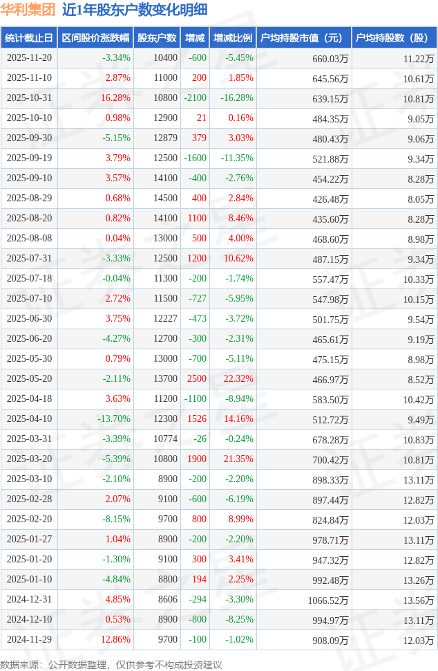 从股价来看,2025年11月10日至2025年11月20日,华利集团区间跌幅为3.34%,在此期间股东户数减少600.0户,减幅为5.45%。