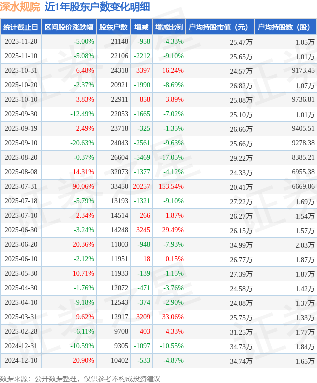 从股价来看,2025年11月10日至2025年11月20日,深水规院区间跌幅为5.0%,在此期间股东户数减少958.0户,减幅为4.33%。