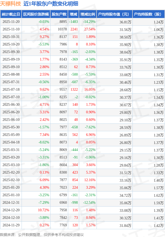 从股价来看,2025年11月10日至2025年11月20日,天禄科技区间跌幅为0.03%,在此期间股东户数减少1483.0户,减幅为14.29%。