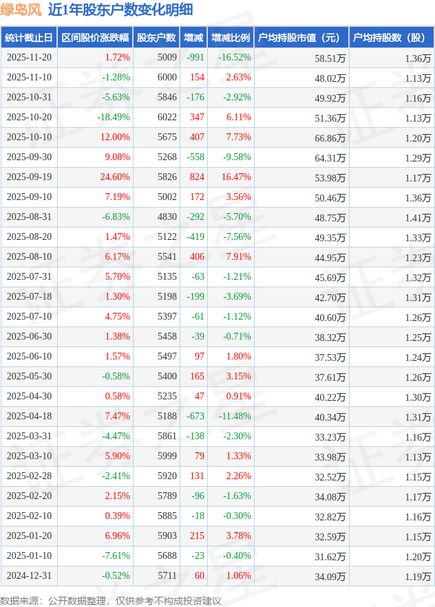 从股价来看,2025年11月10日至2025年11月20日,绿岛风区间涨幅为1.72%,在此期间股东户数减少991.0户,减幅为16.52%。