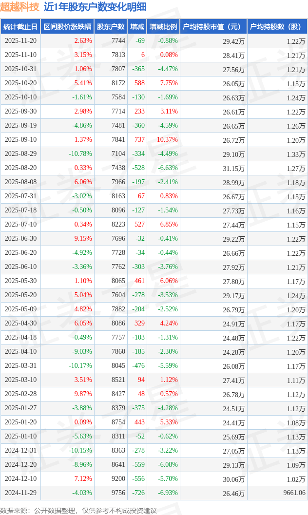从股价来看,2025年11月10日至2025年11月20日,超越科技区间涨幅为2.63%,在此期间股东户数减少69.0户,减幅为0.88%。