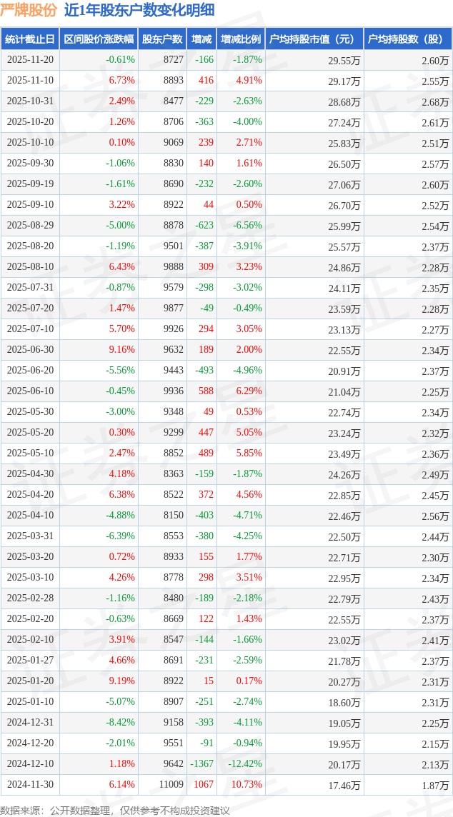 从股价来看,2025年11月10日至2025年11月20日,严牌股份区间跌幅为0.61%,在此期间股东户数减少166.0户,减幅为1.87%。