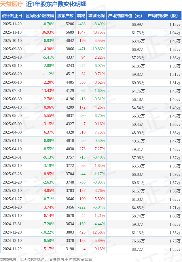 从股价来看,2025年11月10日至2025年11月20日,天益医疗区间跌幅为0.7%,在此期间股东户数减少483.0户,减幅为8.49%。