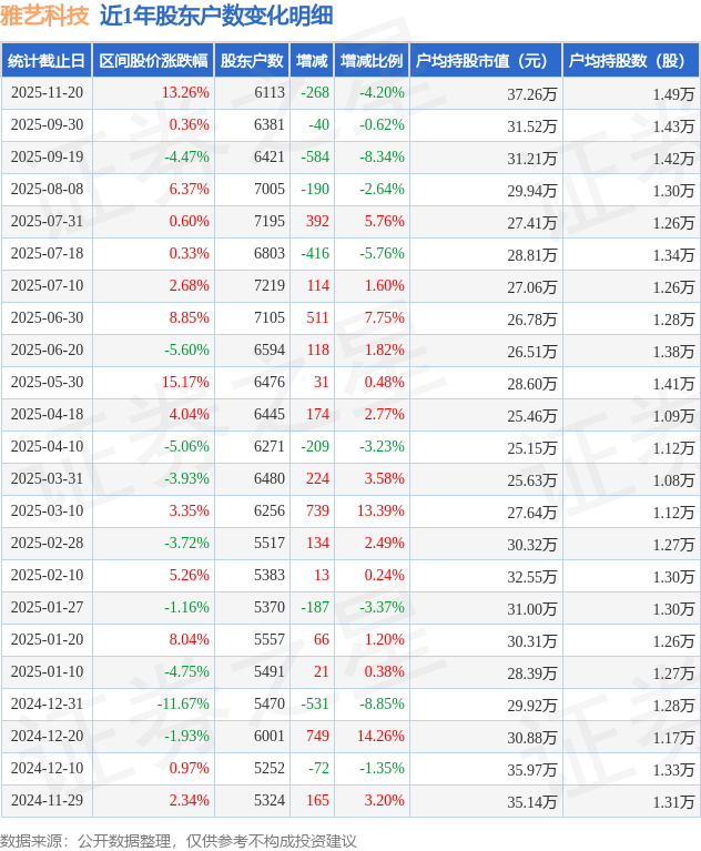 从股价来看,2025年9月30日至2025年11月20日,雅艺科技区间涨幅为13.26%,在此期间股东户数减少268.0户,减幅为4.2%。