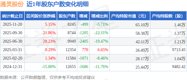 从股价来看,2025年9月30日至2025年11月20日,通灵股份区间涨幅为5.15%,在此期间股东户数减少499.0户,减幅为5.71%。