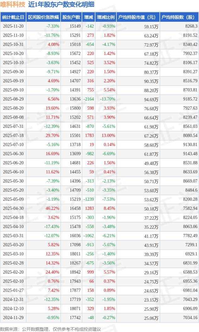 从股价来看,2025年11月10日至2025年11月20日,唯科科技区间跌幅为7.33%,在此期间股东户数减少142.0户,减幅为0.93%。