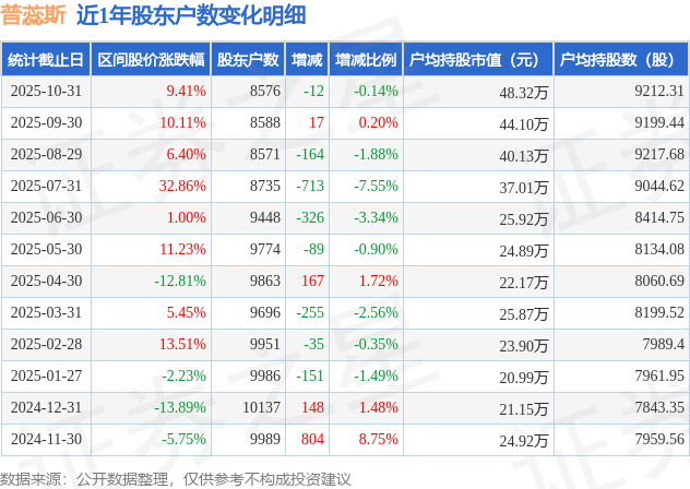 从股价来看,2025年9月30日至2025年10月31日,普蕊斯区间涨幅为9.41%,在此期间股东户数减少12.0户,减幅为0.14%。