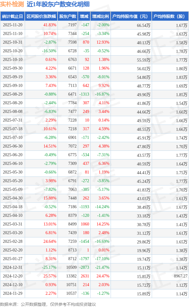 从股价来看,2025年11月10日至2025年11月20日,实朴检测区间涨幅为41.83%,在此期间股东户数减少147.0户,减幅为2.0%。