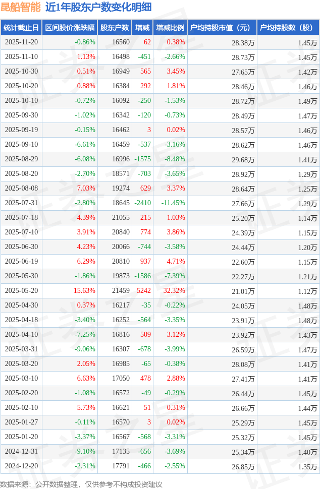 从股价来看,2025年11月10日至2025年11月20日,昆船智能区间跌幅为0.86%,在此期间股东户数增加62.0户,增幅为0.38%。